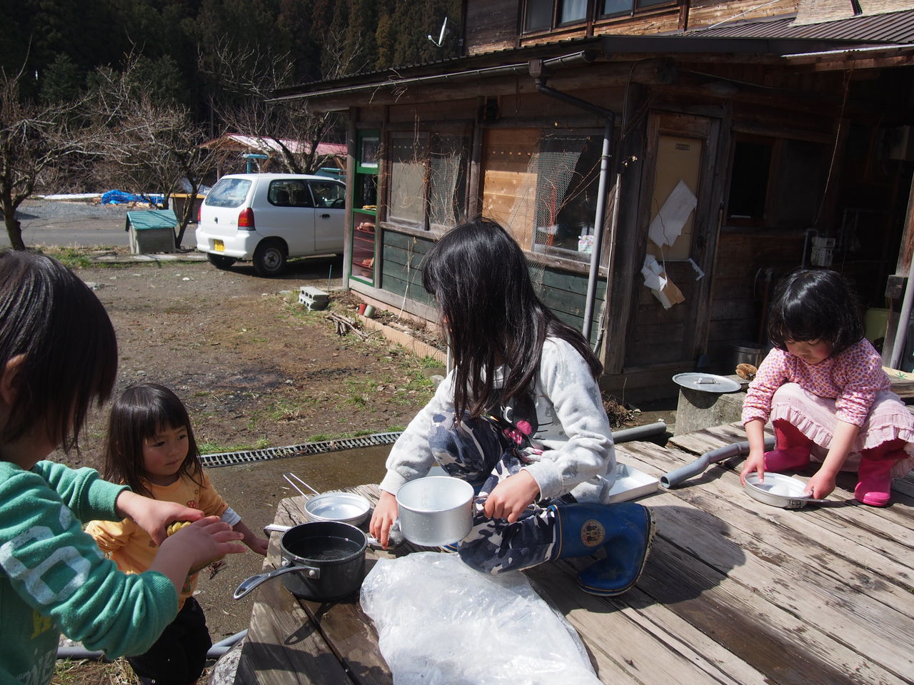 ウッドガスストーブで米粉パンケーキ作り、大工仕事まっただ中の田歌舎スタッフからもらった木っ端を使った積み木遊びや作品作り、フキノトウ探し、水遊び、などなど、自然と遊びが展開しました!