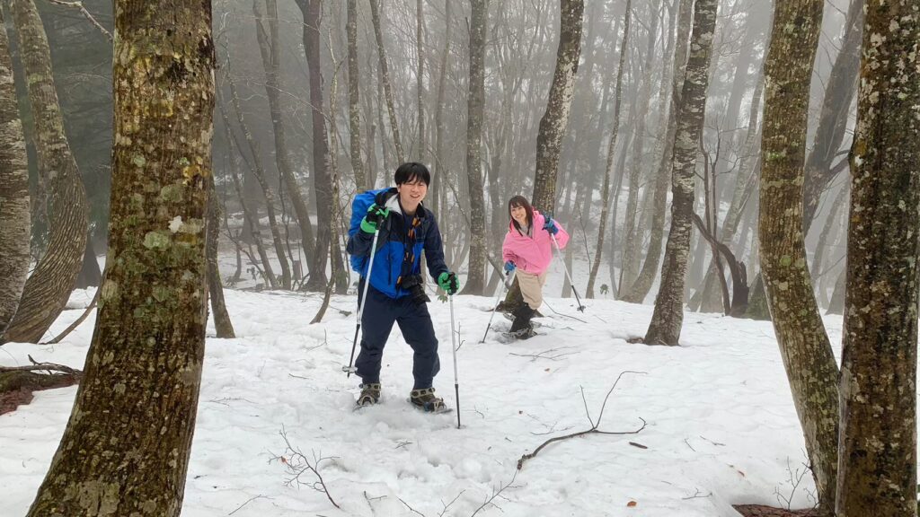 スノーシューと呼ばれるスポーツ用のカンジキを履いて冬の森を歩く、冬のトレッキングツアー。